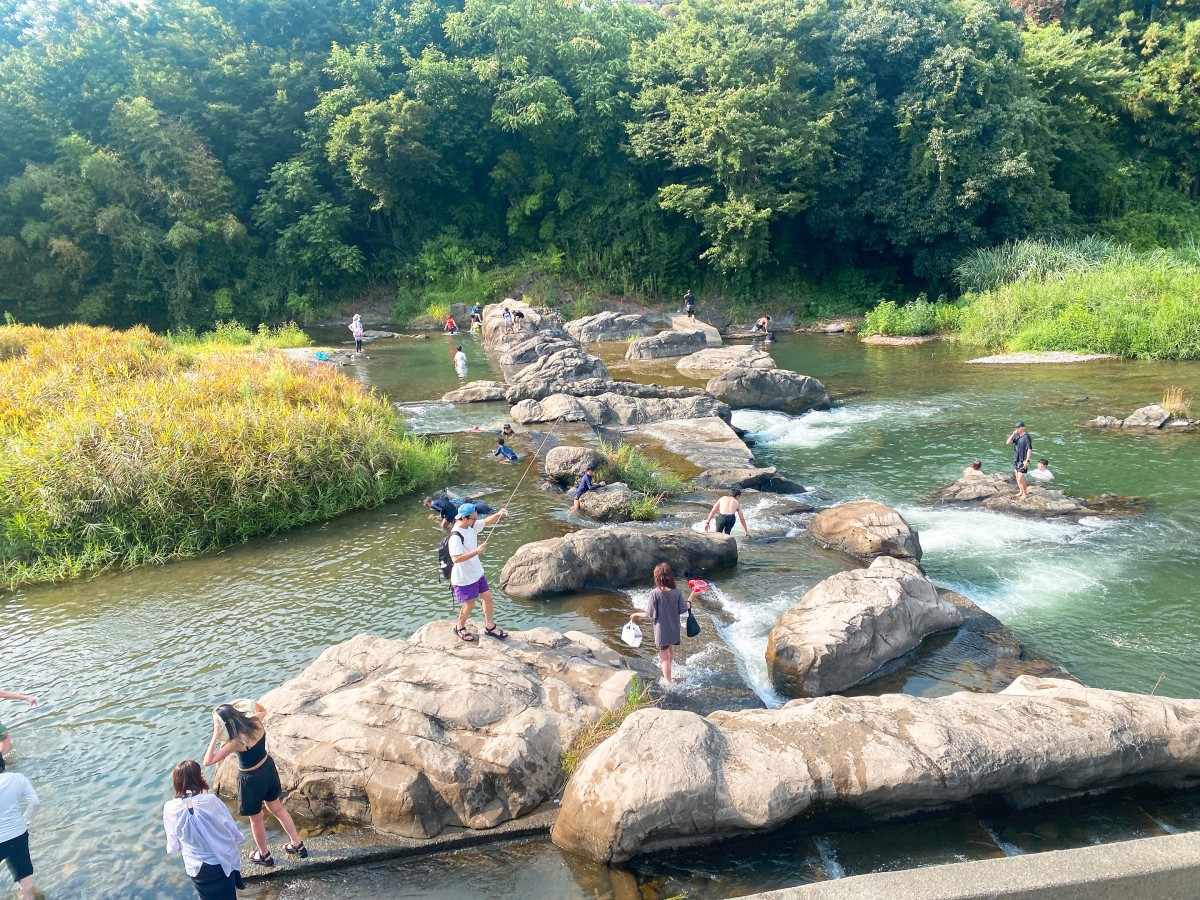 服の下に水着を着て、秋川渓谷へ。川チャプを楽しみに思いつつも、この猛暑で焦げ死ぬのではと心配しながら塩飴や芋や羊羹など、登山の行動食のようなものばかり買おうとしている私に「はなちゃん、もう死を意識しなくていいんだよ」と囁く友人。クマ注意のポスター。川に着くまでは、死を意識しながらSOUL'd OUTを聴いていたのだが、川にはフレッシュな若者が多く、イメージソングはORANGE RANGEの「花」に切り替わった。ナンパする男、隠されながら着替える女。偶然それぞれキンパを持ち寄ったので、意図せずキンパピクニックとなった。一昨年来た時よりも水位が明らかに減っている。忘れられた西瓜のビーチボールを抱え、川の流れに身を任せる。